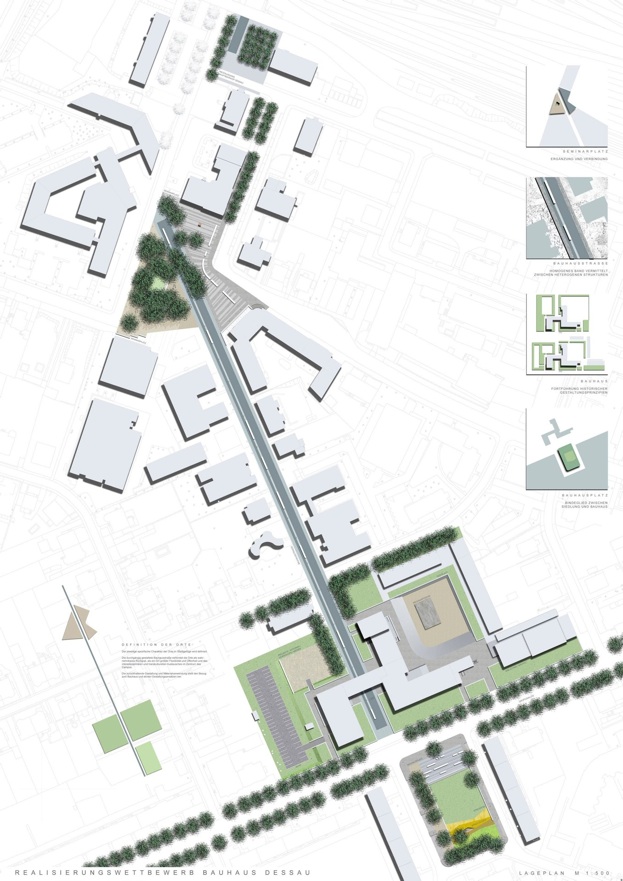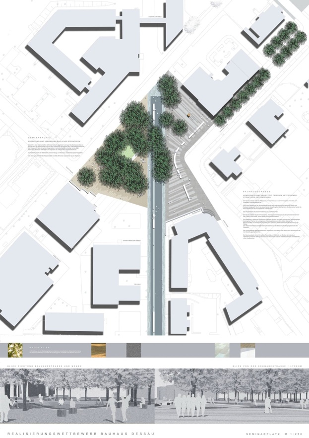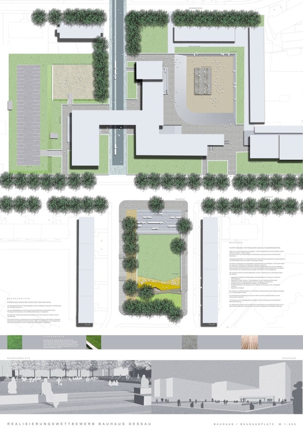 Besonders gewürdigt werden die Vorschläge im Umfeld des Bauhauses. Der Bau wird in seiner Plastizität betont, die Freiräume sind in Charakter und Proportionen der wichtigen historischen Situation angemessen und bieten doch, insbesondere durch die Gestaltung des Festplatzes auch neue Möglichkeiten der Nutzung.... Der Bauhausplatz ist gut gelöst. Mit ruhiger aber durchaus spannungsvoller Gestaltung vermittelt er zu den angrenzenden Wohnbauten und bildet zugleich ein angemessenes Vorfeld des Bauhausgebäudes.....“