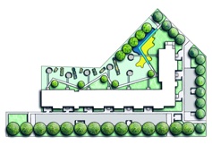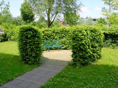 Zum nördlich angrenzenden Kitabereich befinden sich in unterschiedlichen Winkeln angeordnete Blütengehölzpflanzungen, die das ungebundene Spielen in "Zwischenräumen" ermöglichen.
