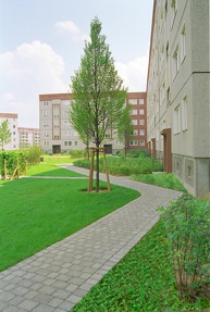 Der Fußgängerbereich und die Hauszugänge wurden durch individuell und unterschiedlich gestaltete Vorgartenbereiche und geschützte, sonnige, südexponierte Sitzplätze neu definiert.