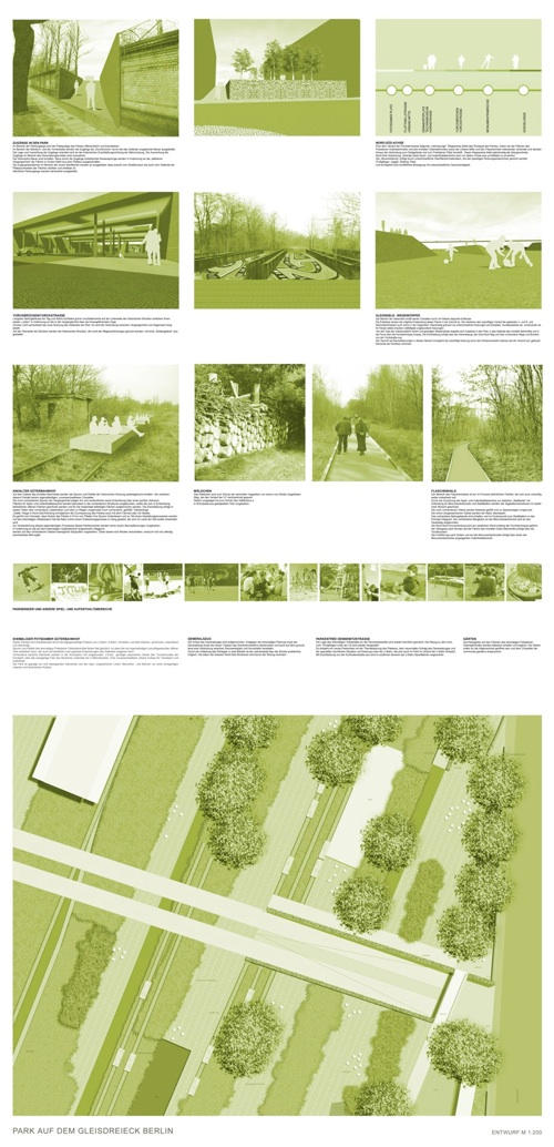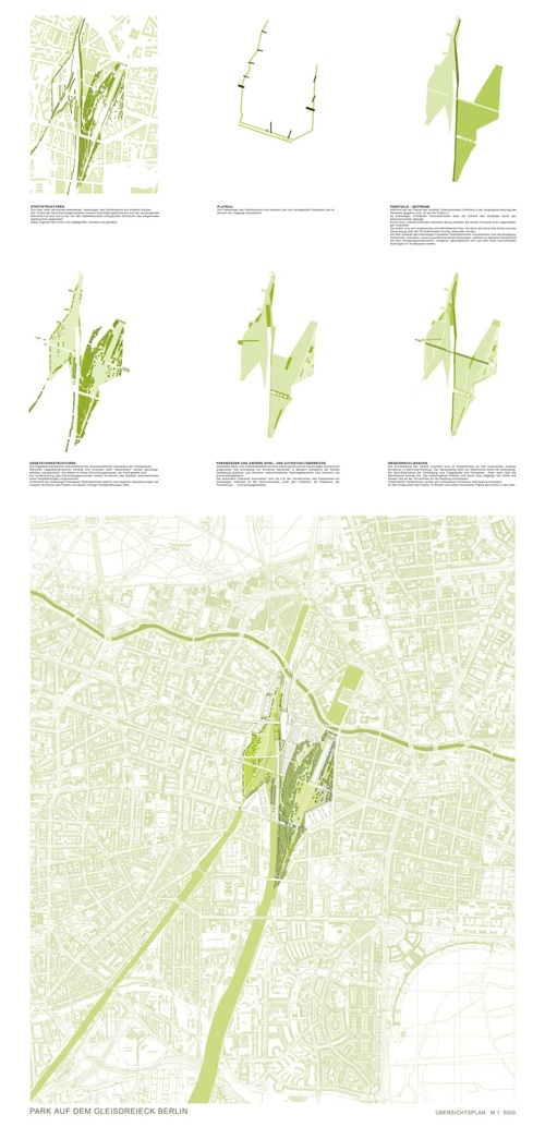 Auf dem Gelände des ehemaligen Potsdamer Güterbahnhofes konzentrieren sich die bewegungsintensiven, schnellen, neuen zukunftsorientierten Nutzungen, während im östlichen Parkbereich die eher bewegungsextensiveren, ruhigeren, geruhsameren sich aus dem Alten entwickelnden Nutzungen im Vordergrund stehen.