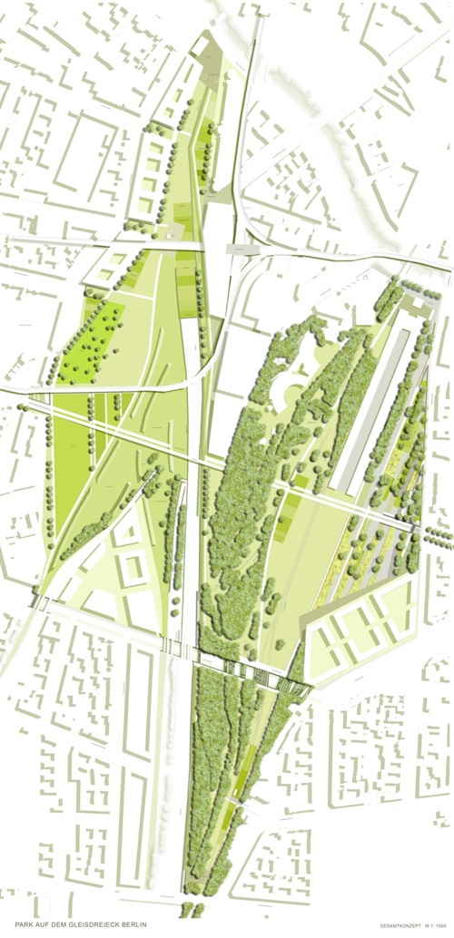 Die Plateaulage des Gleisdreiecks wird erhalten und vom umliegenden Stadtraum aus im Bereich der Zugänge thematisiert.