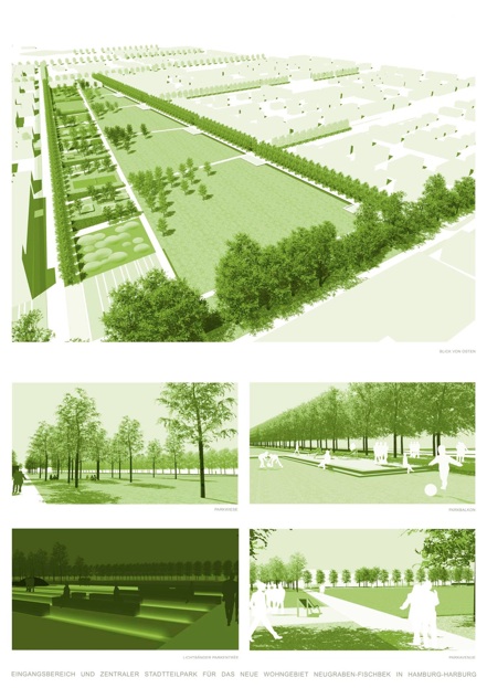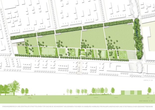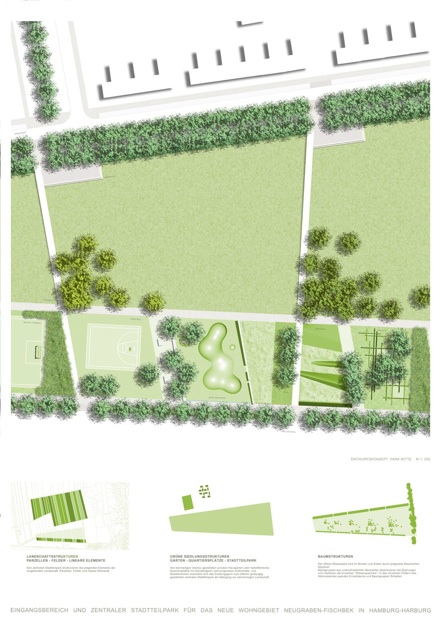 Den zentralen Stadtteilpark strukturieren die prägenden Elemente der umgebenden Landschaft: Parzellen, Felder und lineare Elemente.