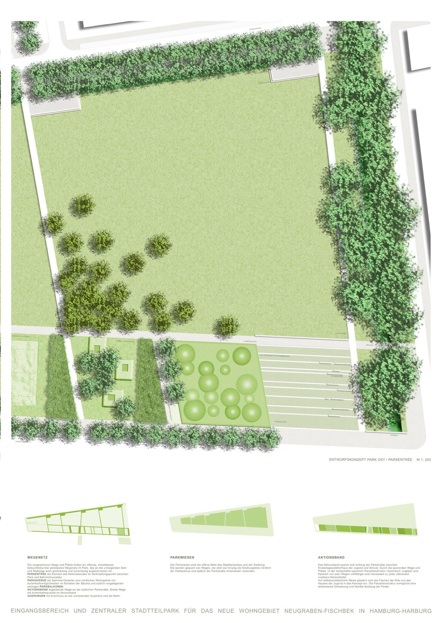 Das Konzept arbeitet einen einsehbaren offenen Wiesenpark heraus, der die in der Umgebung anzufindenden vorhandenen Strukturen der Parzellen, Felder und linearen Elemente gestalterisch aufnimmt. Die im Parkbereich vorhandenen landschaftlichen Elemente werden Bestandtteil des Gesamtkonzeptes.