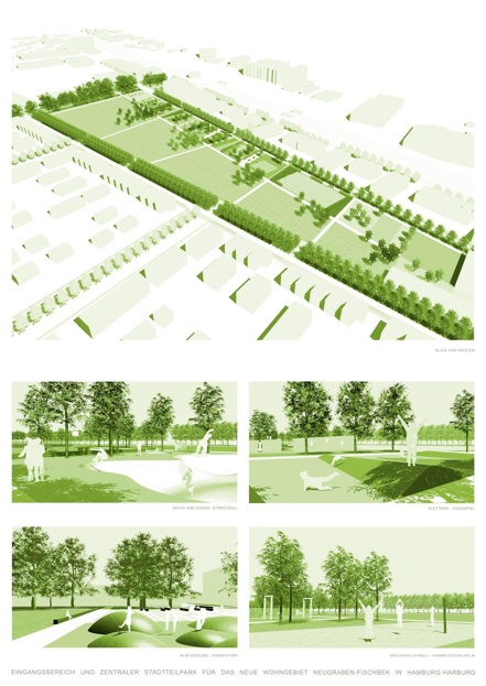 Von kleinteiligen intensiv gestalteten privaten Hausgärten über halböffentliche Quartiersplätze entwickelt sich das Siedlungsgrün in seiner Maßstäblichkeit zum offenen großzügig gestalteten zentralen Stadtteilpark als Übergang zur weiträumigen Landschaft.