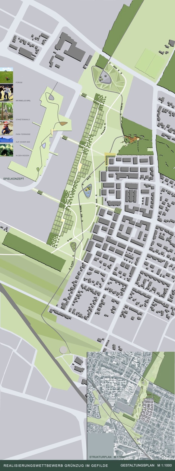 Die Kleingärten werden entsprechend den planerischen Vorgaben umgesetzt. Die drei Schollen erhalten durch ein Band aus Obstbäumen ihre Verankerung im Raum.