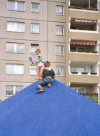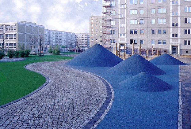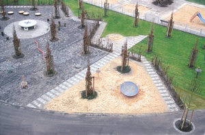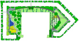 Massive freiwachsende Blütenhecken beeinflussen durch ihre Stellung untereinander und annähernd senkrecht zum Zaun den Blick perspektivisch und erweitern somit den schmalen Raum optisch. Die Aufenthaltsbereiche sind nicht altersbezogen definiert, werden aber durch ihre unterschiedlichen Charaktere eher von der einen als von der anderen Nutzergruppe bevorzugt genutzt. Die Spielmöglichkeiten müssen mit sich ändernder Bevölkerungsalterung auch den späteren Anforderungen genügen. Daher sieht der Entwurf hauptsächlich die räumliche Situierung einzelner Bereiche vor, gewährleistet die Multifunktionalität aller Flächen für alle Altersgruppen und zeigt ein „Bild“ aus den Fenstern der oberen Geschosse.