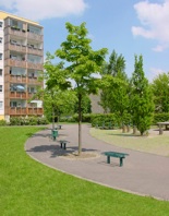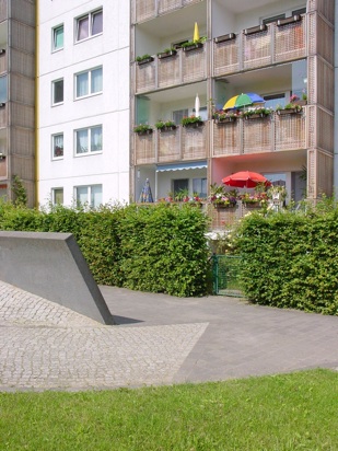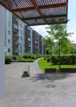 Die Fläche des Wohnhofes wird durch die ausgegrenzte Fläche einer Kindertagesstätte stark zerteilt. Die zur Nutzung übrigbleibende Resthoffläche besteht aus einem westlichen und östlichen Bereich, die durch einen dritten sehr schmalen Teilbereich verbunden sind. Ein markanter Bogenweg soll die Teilbereiche zusammenfügen und verbindet auf relativ direktem Wege gleichzeitig drei der vier Eingänge/Durchgänge des Hofes. Der sich in seiner Breite entwickelnde Asphaltweg findet seinen Höhepunkt in einer Aufweitung, die ihn -begleitet von Bäumen- als multifunktionale Fläche nutzbar werden lässt. Gleichzeitig grenzt dieser Weg verschiedene Nutzungsbereiche untereinander ab.