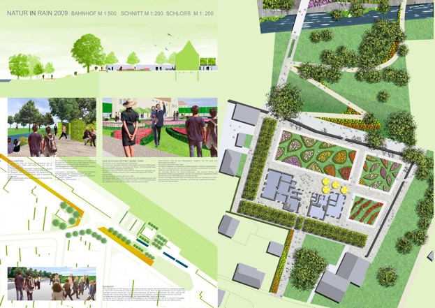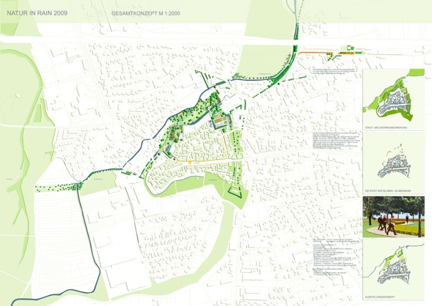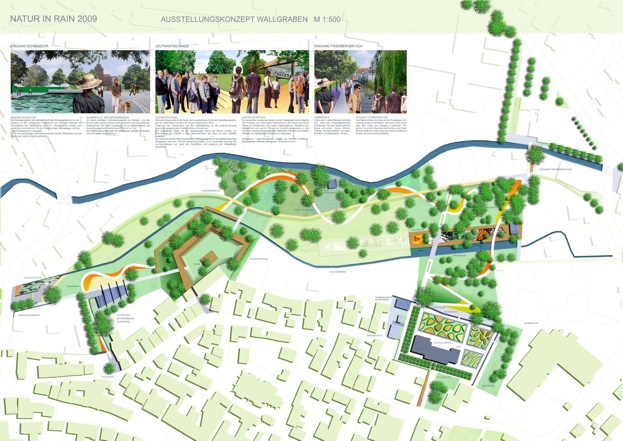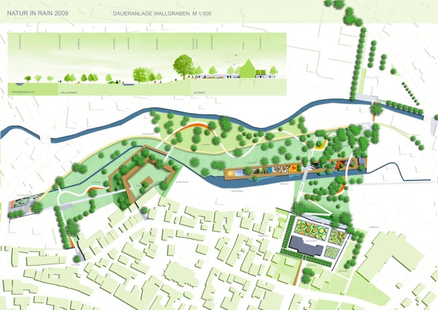 Die einzelnen Zonierungen im und um den Innenstadtbereich der Stadt Rain werden gestalterisch klar definiert und erlebbar gemacht: Altstadt, Wallgraben, Friedberger Ach