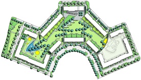 Der Wohnhof besitzt - bedingt durch die abgewinkelte Stellung der Einzelgebäude - keine klare Raumkante. An diesem Spezifikum setzt das zentrale Gestaltungskonzept für den Innenhof an. Die zahlreichen "Bruchstellen" werden durch "Baumnähte" zusammengefügt. Diese Baumgruppierungen orientieren sich jeweils an markant verlaufenden Wegen, die dem direkten Durchqueren des Hofes dienen und die Bruchstellen des Hofes thematisieren. Die innere Erschließung des Hofes erfolgt über peripher verlaufende Wege, welche die Zugänge zum Hof sowie seine drei Schwerpunkte miteinander verbinden. Dieses sind jeweils ein Spielbereich an den Endpunkten des Hofes sowie mittig ein Aufenthaltsbereich, dessen Durchgang durch das Gebäude eine wichtige Verbindung zur nördlich anschließenden Fläche des „Kirchendreiecks“ bildet.
