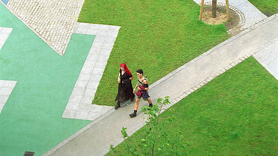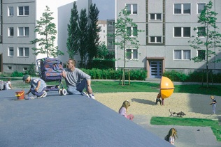 Die Spielbereiche haben unterschiedliche Gestaltungssthemen; der östliche Spielbereich widmet sich mehr dem Kleinkinderspiel und bindet an schon vorhandene Hofflächen an, die westlich gelegene „Spielgalaxy", als Überformung eines noch aus den Hochbaumaßnahmen vorhandenen Erdkörpers, ist mehr den älteren Kindern und ihrem Bewegungsdrang gewidmet. Als Gestaltungselemente der "Vorgartenzone" wurden als Pendant zu der strengen Baukörperform raumbildende Hecken, unterschiedliche Wegebreiten mit platzartigen Erweiterungen - auch als Flächen für die Feuerwehr- im Wechselspiel mit den Vorgärten gewählt sowie eine stringente Grünbegrenzung zum Straßenraum.